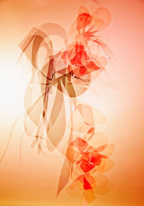 Dans ces images, des formes lumineuses que j'inscris dans l'espace se déploient à l'intérieur de chambres d'hôtels ou d’autres espace de travail temporaires. Parfois ce sont des mobiles en papiers découpés que j'anime comme des marionnettes et dont j'enregistre les mouvements. Durant les séances de travail j’exécute une sorte de danse folle. Les battements des stroboscopes agissent comme un métronome, les mouvements constants de mon corps qui tisse des formes avec la lumière tout en restant invisible dans l'image vont crescendo, je délire. Je poursuis une image mentale floue qui change continuellement et qui menace de disparaître, ça sent l’urgence. Je suis un fil d'Ariane évanescent fait de questions et d'hypothèses de travail jusqu'à l'épuisement. Toutes sortes d'émotions émergent, les crises de colères sont fréquentes, c'est très physique.